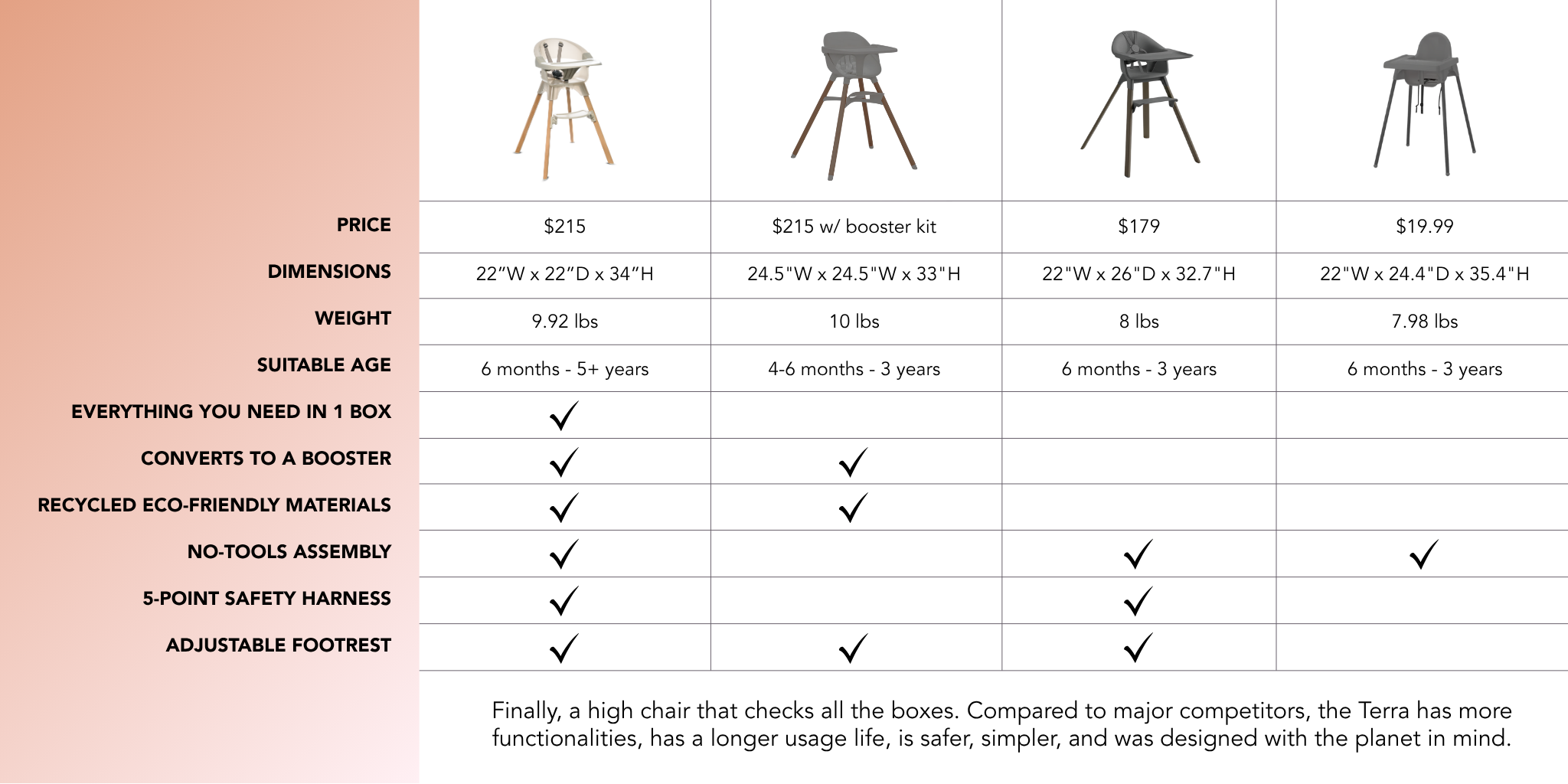 Introducing our innovative 2-in-1 Terra high chair and booster seat, the ultimate solution for modern families seeking elegance and practicality. Designed to grow with your child from 6 months to 5+ years, it seamlessly transitions from a high chair to a booster seat, offering up to 10+ different configurations to adapt to your child's needs. Assembly is a breeze with our no-tools-required setup, taking under 1 minute to assemble and saving you time and hassle.