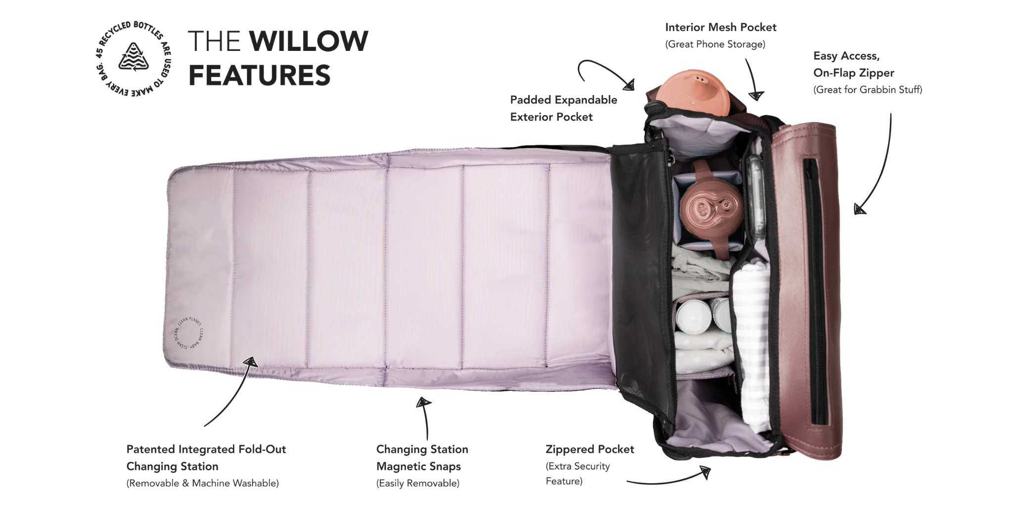 Making on-the-go diaper changes a breeze, anywhere, anytime. Meet the original diaper bag with a patented, integrated fold-out changing station, The Willow.
